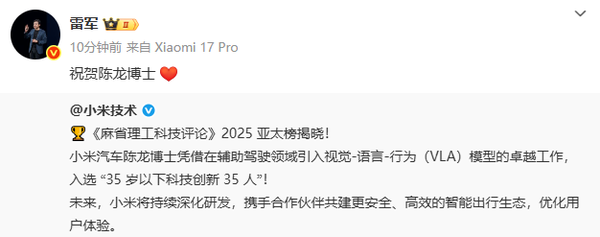 【CNMO科技消息】近日,《麻省理工科技评论》正式发布2025年度亚太区“35岁以下科技创新35人”(TR35)榜单,小米汽车主任科学家陈龙博士凭借在辅助驾驶领域引入视觉-语言-行为(VLA)模型的突破性工作成功入选。11月30日,小米集团创始人、董事长兼CEO雷军公开祝贺陈龙获奖。